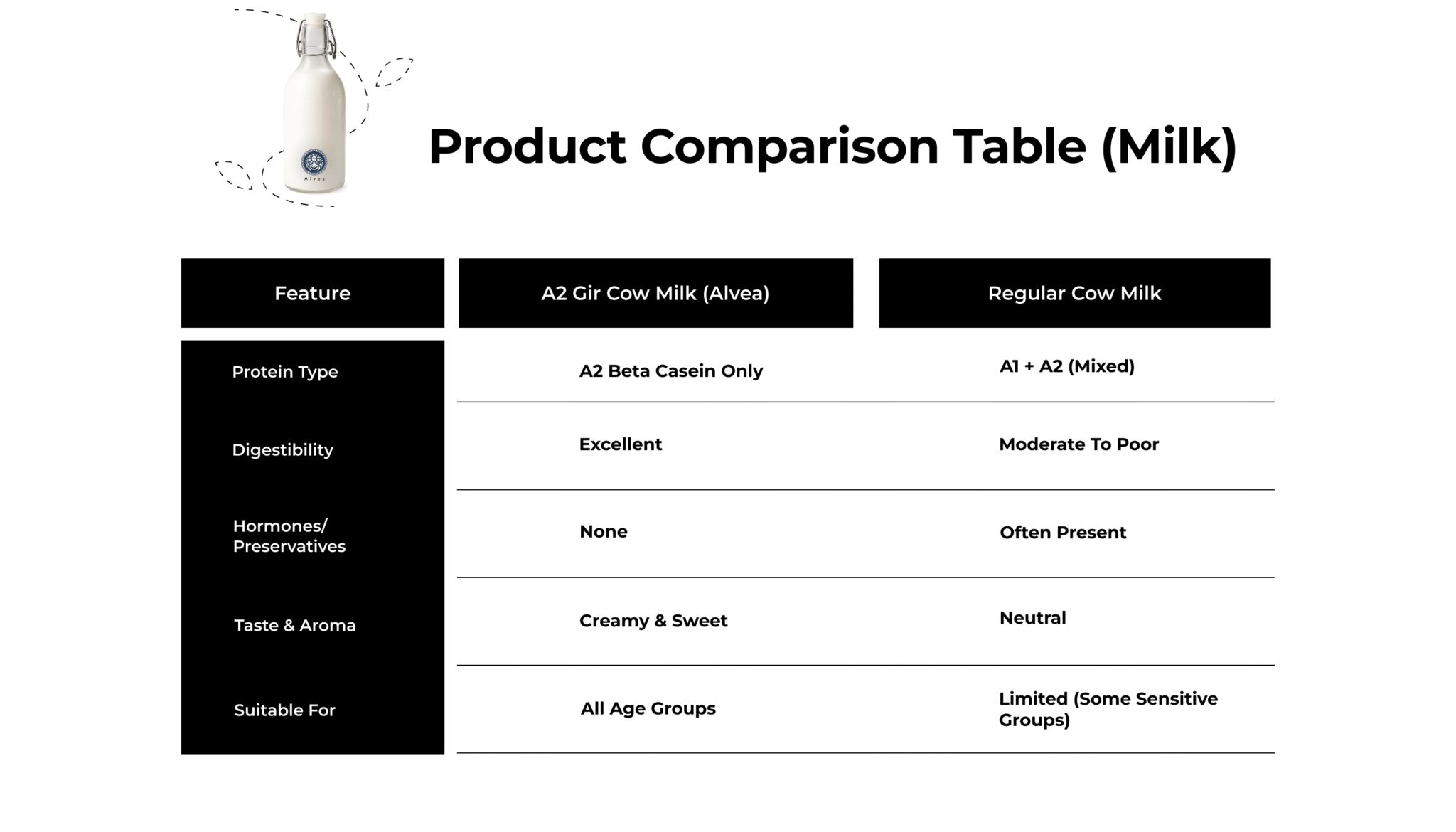 Whether you’re a new mom nurturing a toddler, a student preparing for exams, or an elder focusing on bone health, Alvea Milk is made for your lifestyle. A2 Gir cow milk is known for being gentler on the stomach, making it ideal for those with lactose sensitivities or digestion issues. Its calcium and protein content also supports growth, cognitive function, and energy levels naturally. Give your children the strength they need, your parents the nutrition they deserve, and yourself the wellness boost you’ve been missing. With Alvea, milk becomes more than nutrition, it becomes love, care, and trust in a bottle or packet.