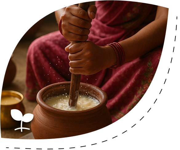 We use the ancient Bilona method, which involves fermenting milk into curd and hand-churning it to extract butter. This method retains the ghee’s medicinal and nutritional properties, making it far superior to commercially produced ghee.